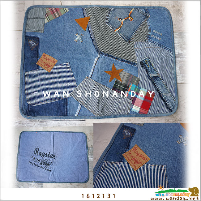 デニムパンツを解体し他のBAGを作るにあたって取り外したパーツを散りばめて作られたアップリケのカフェマット。