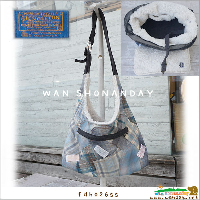 ペンドルトンのチェック柄ウール素材をパッチワークして、出来るだけシンプルに仕上げたオープントップのスリングバッグ。