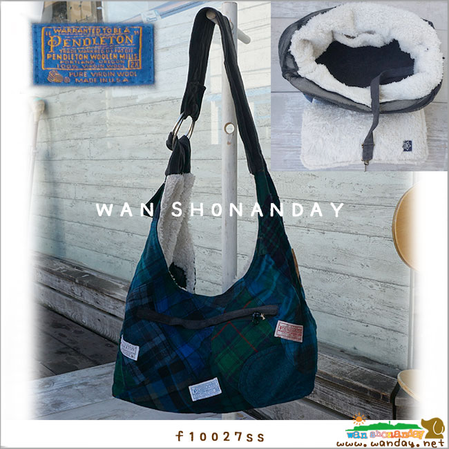 ペンドルトンのチェック柄ウール素材をパッチワークして、出来るだけシンプルに仕上げたオープントップのスリングバッグ。