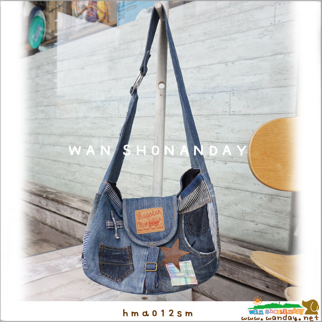 | デニムパンツを解体して作ったスリングのM。他のバッグを作るにあたって取り外したパーツを散らばめてアート! それぞれ1点物のRAGSTARの中でも さらにさらに レアレアな逸品(*^_^*) |