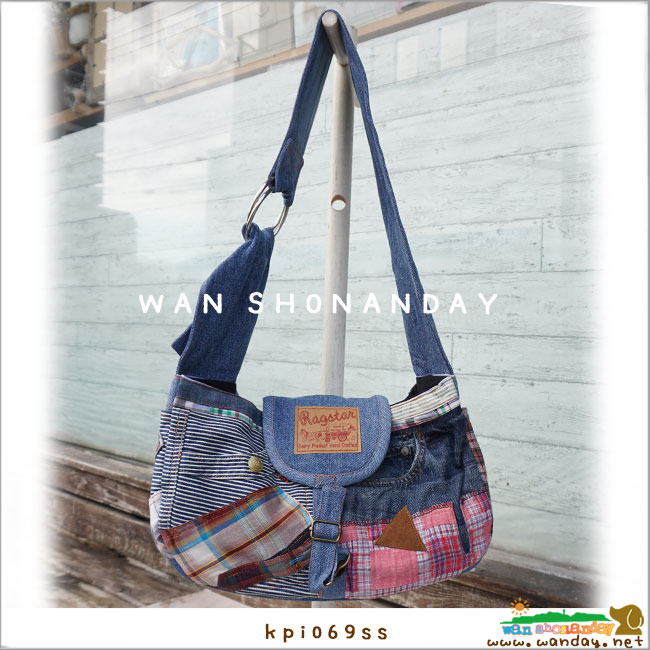 | デニムパンツを解体して作ったスリング。他のバッグを作るにあたって取り外したパーツを散らばめてアート! それぞれ1点物のRAGSTARの中でも さらにさらに レアレアな逸品(*^_^*) |